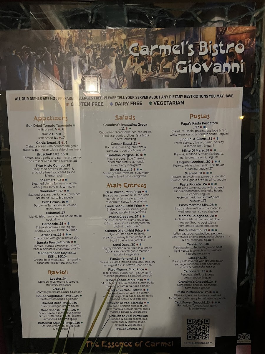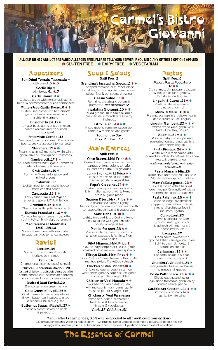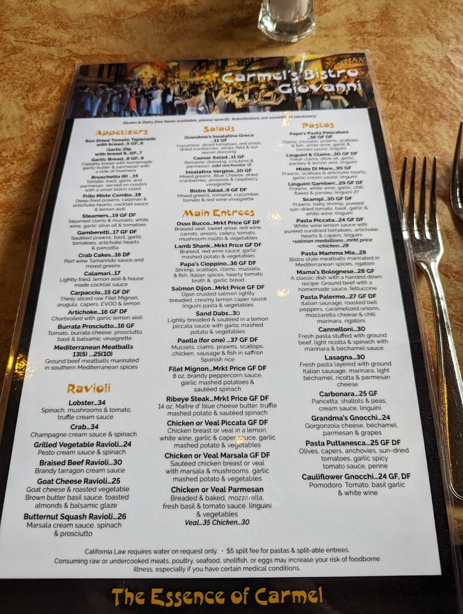 Situated artistically between 5th and 6th Avenues in the picturesque town of Carmel-By-The-Sea, Carmel's Bistro Giovanni is an inviting Italian restaurant that captures the heart of its visitors through culinary excellence and a charming ambiance. Known for its authentic Italian dishes, this bistro perfectly balances classic flavors with a modern dining experience, making it a must-visit destination for both locals and tourists alike.